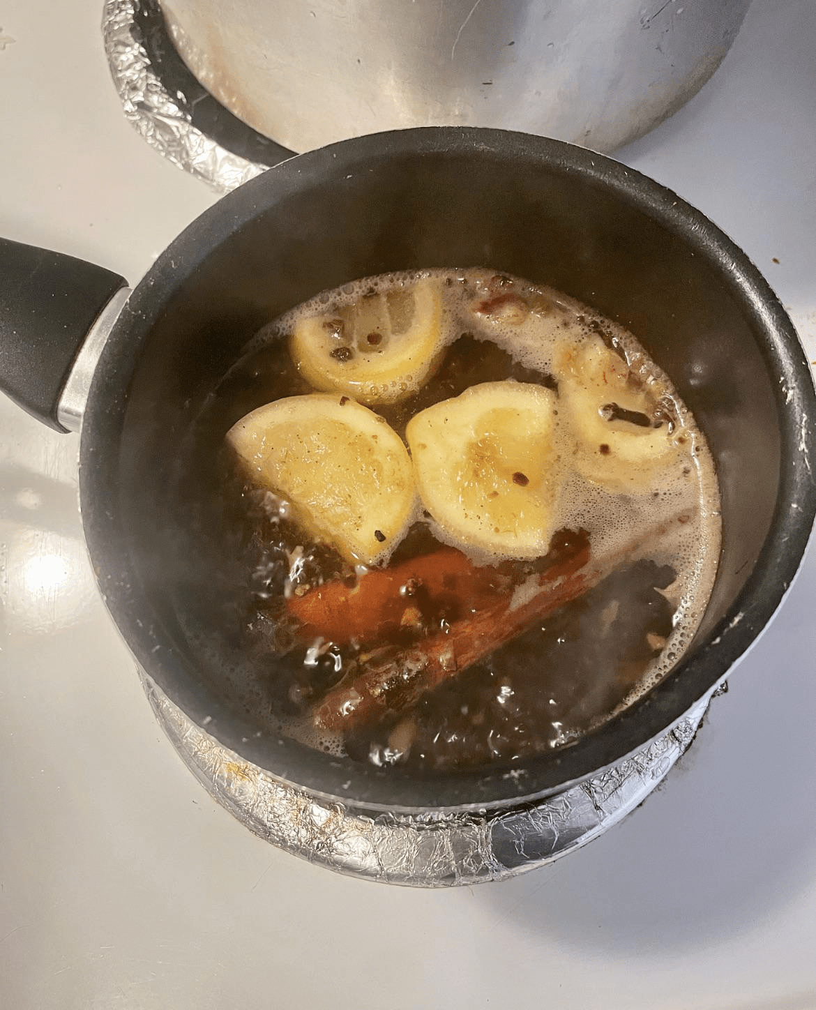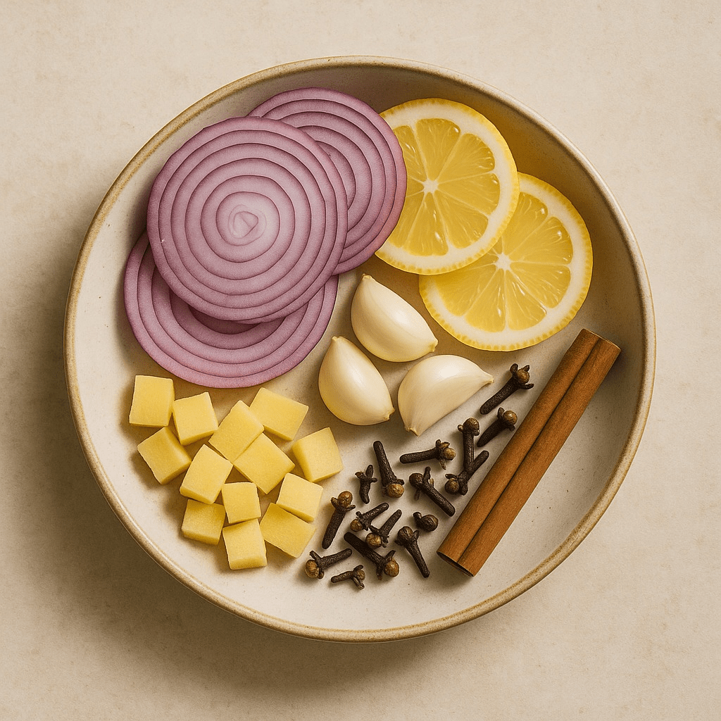 1. Gather1 stick cinnamon, 5 whole cloves, 2 cloves garlic (smashed), 1-inch ginger (sliced), ½ onion (quartered), 1 whole lemon (quartered)Everything goes in skin-on for maximum power