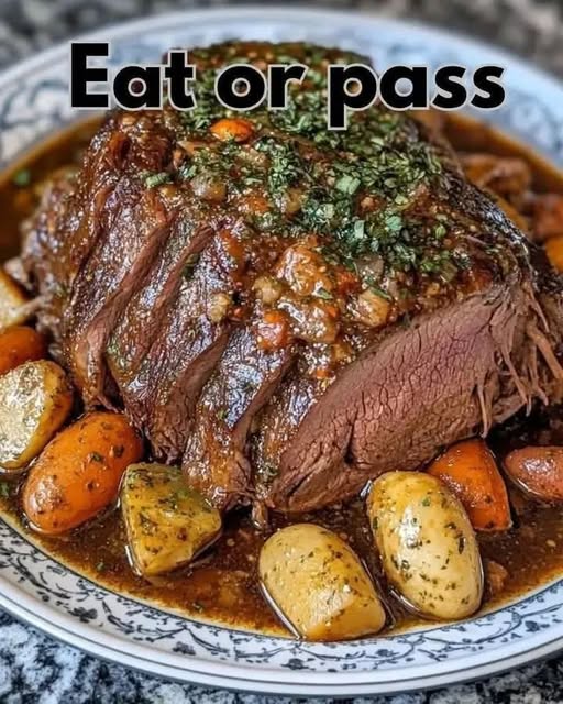 - Remove roast and shred or cut into large pieces, while removing fat, then return to pot. Remove bay leaf and herb sprigs. Serve warm.