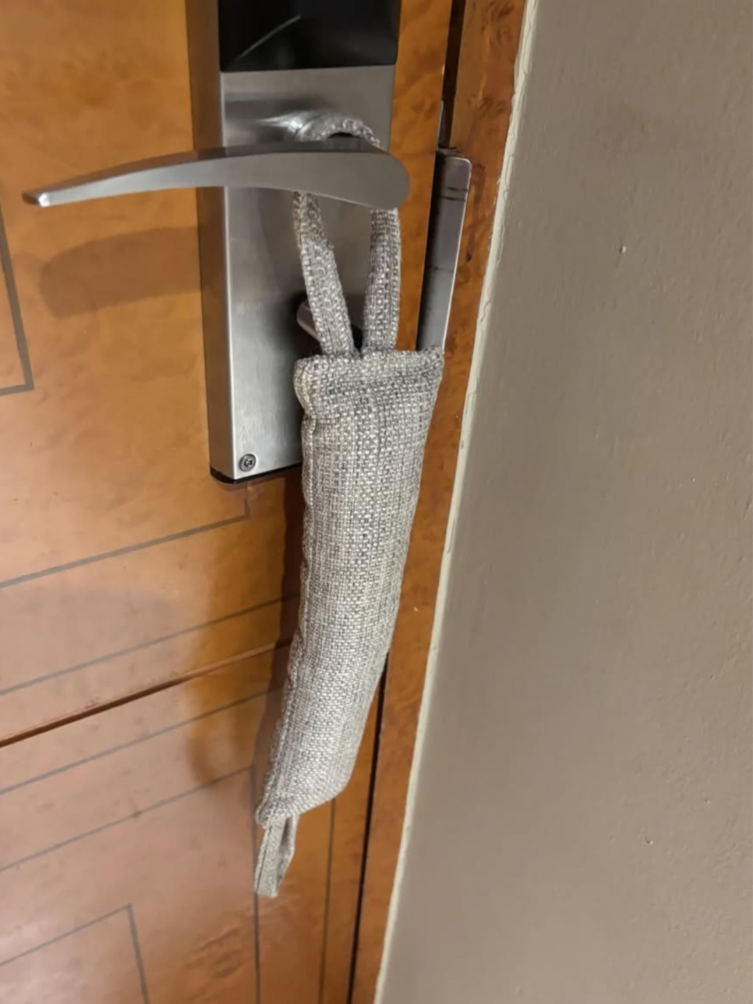 That odd little fabric-covered pad tied to the hotel room door handle — sometimes fluffy, sometimes squished, always a little mysterious.