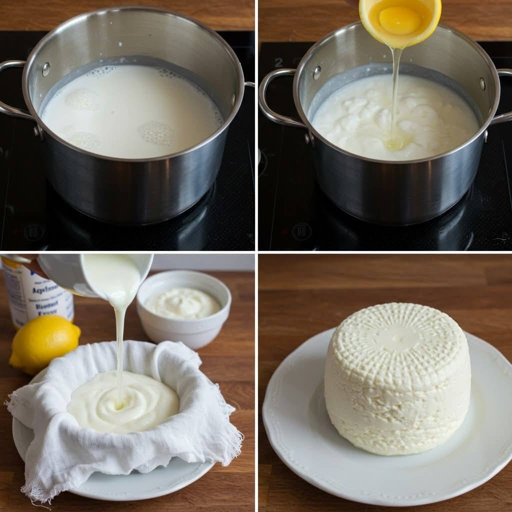 Then, strain the mixture into another saucepan and pour it through a cloth or kitchen towel to separate the cheese from the whey. Form
