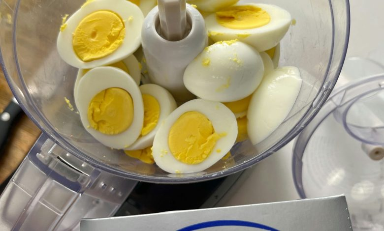 - Prepare Eggs for Processing: Take 6 of the hard-boiled eggs and place them whole into a large food processor. For the remaining 6 eggs, cut them in half. Add only the yolks to the food processor with the other 6 whole eggs, and set the egg whites aside.