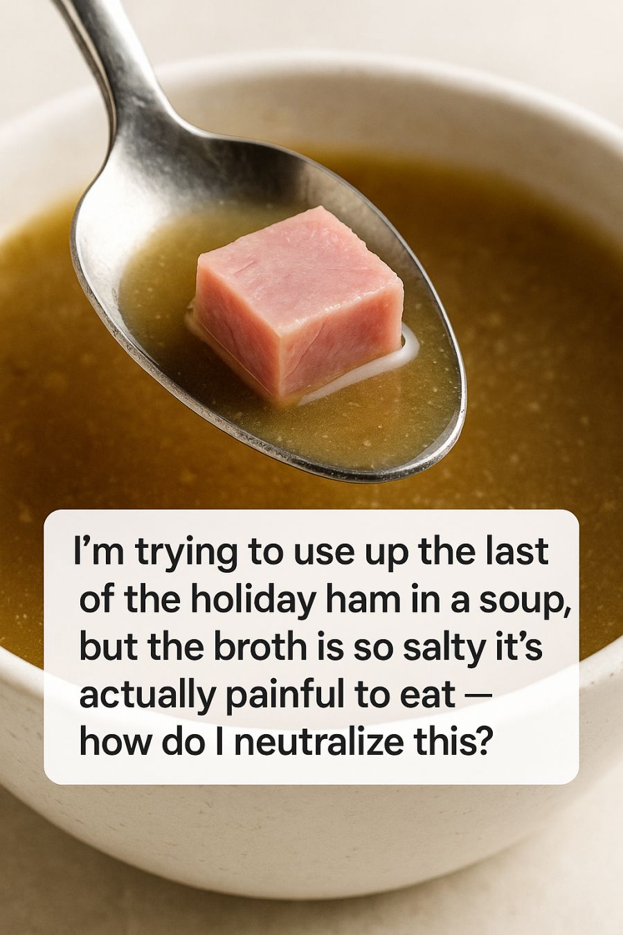 When you boil ham in water to make soup, the salt dissolved in the meat leeches into the broth. If you then reduce the broth by simmering it, the concentration of salt increases even further. This can turn a potentially delicious soup into something that’s too salty to enjoy.