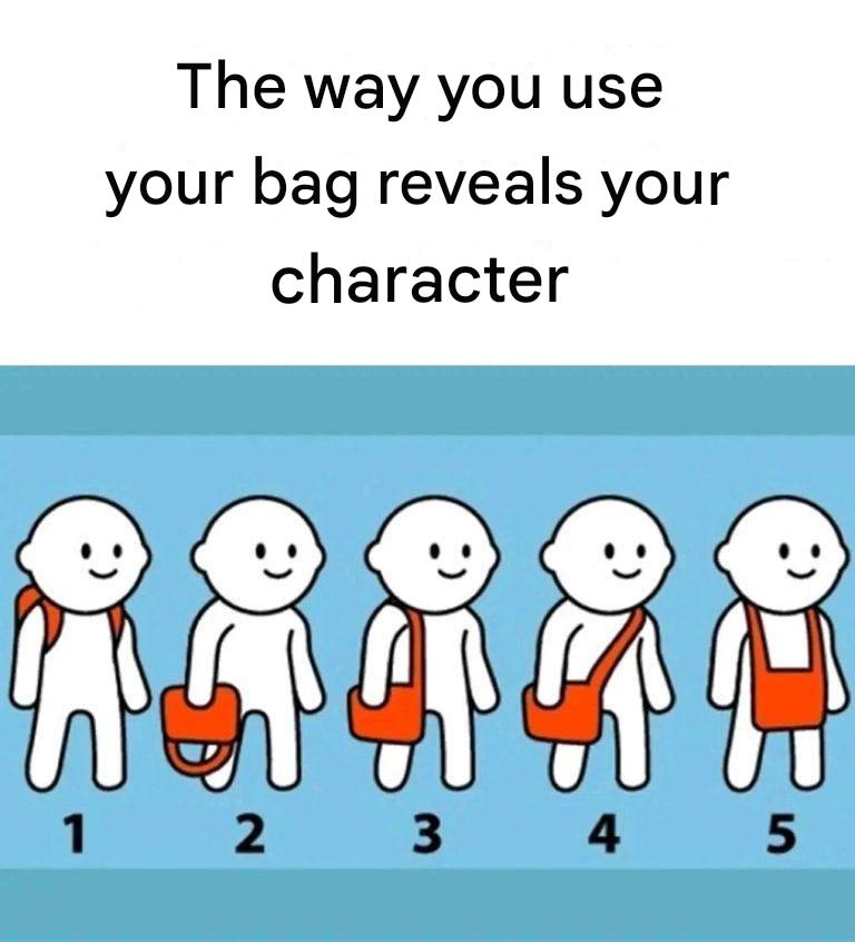 2. Carrying by hand: If you like to carry your bag and other belongings in your hand, it indicates that you like to do everything thoroughly and be in control. You always want to be informed about what’s going on and have an opinion about everything. You are a straightforward but also reliable person.